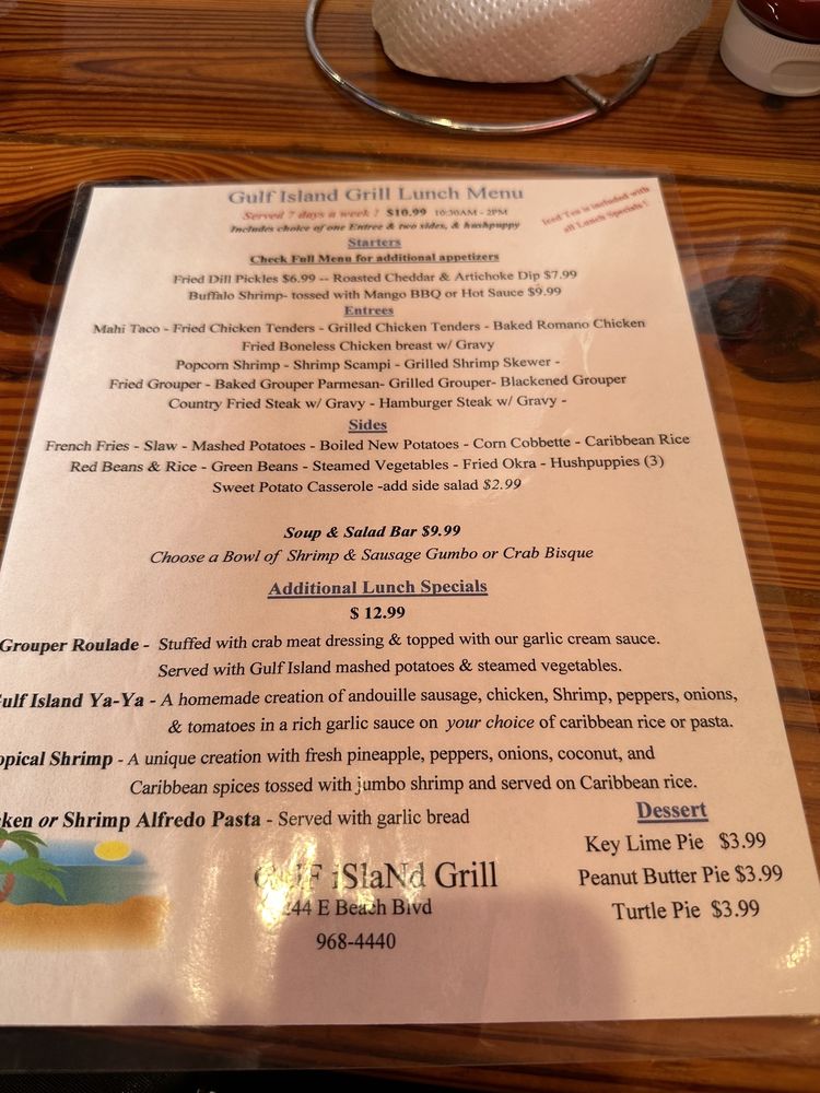 Welcome to the Gulf Island Grill, where seaside charm meets culinary delight. Located at 244 E Beach Blvd, Gulf Shores, AL, this casual American seafood restaurant is a true gem for seafood lovers and families alike. With a menu that shines a spotlight on local flavors, indulge in hearty offerings like the Crab Bisque and the robust Seafood Gumbo, both rich in taste and tradition.